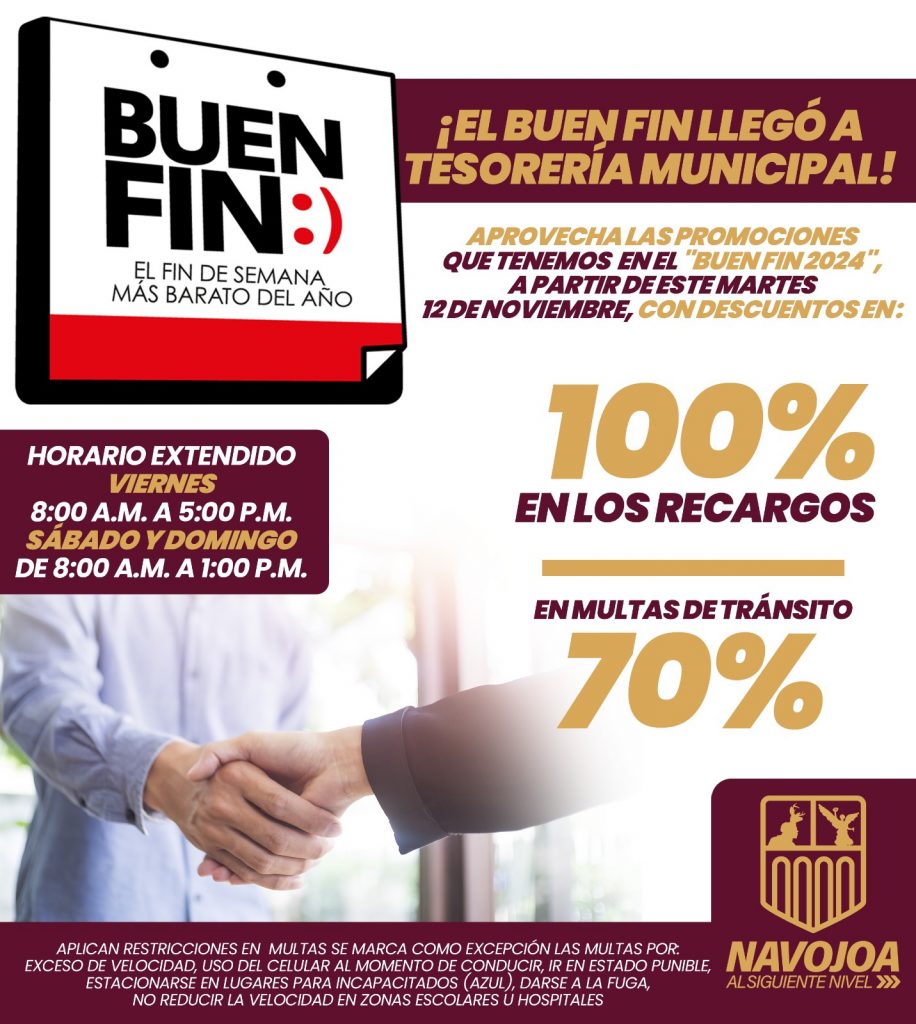 Aprovecha las promociones que tenemos en el “Buen Fin 2024”,a partir de este martes 12 de noviembre, con descuentos de 100 por ciento en el pago de recargos por adeudos del Impuesto Predial y 70 por ciento en multas de Tránsito.