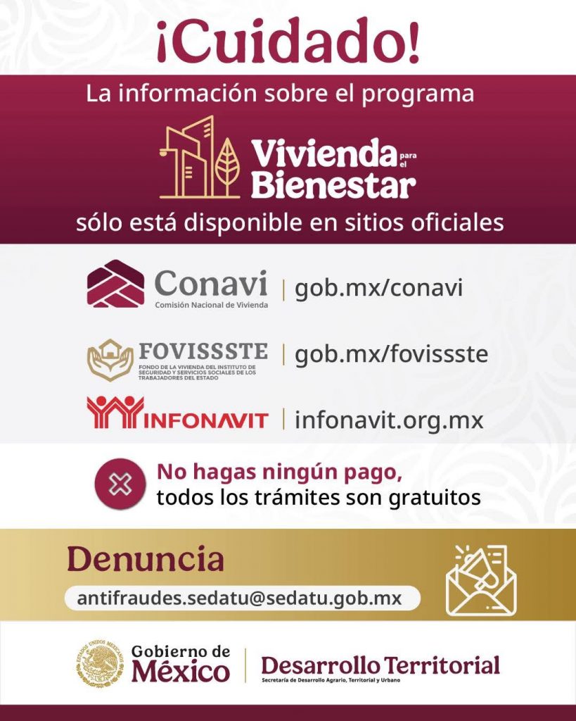 🚨 ¡Atención! Si deseas acceder a una vivienda nueva, apoyo para mejoramiento o escrituración a través del programa Vivienda para el Bienestar, consulta únicamente los sitios oficiales de CONAVI, Fovissste e Infonavit.
