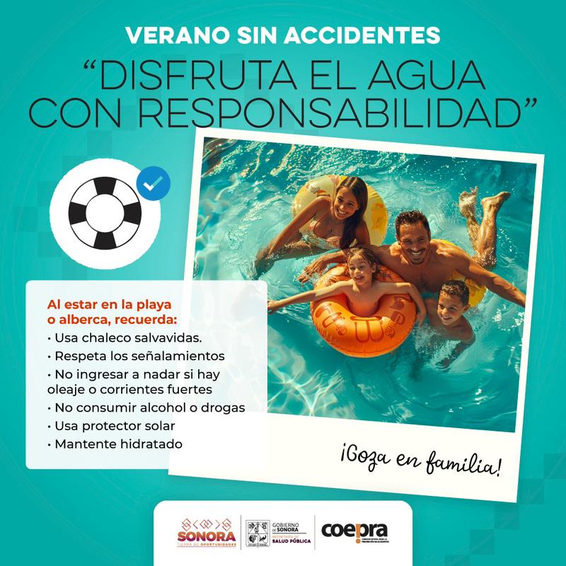 Hermosillo, Sonora.- La Secretaría de Salud (SSA) advirtió sobre los accidentes que pueden ocurrir en albercas y balnearios, por lo que hizo una serie de recomendaciones para que las familias se cuiden, especialmente a niñas y niños menores de edad.