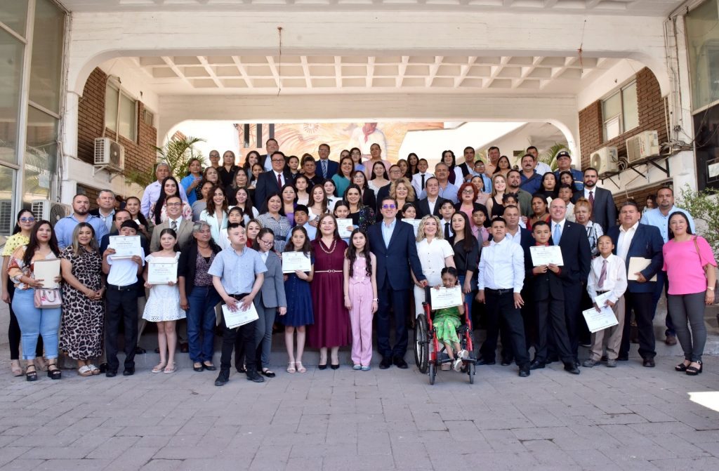 La ceremonia en Palacio, enmarcada en el festejo del Día del Niño, estuvo presidida por el alcalde Jorge Alberto Elías Retes, la síndica Martha Elena Armenta Tejeda, el cuerpo de ediles, funcionarios del gabinete, padres y madres de familia, docentes y la presidenta de DIF, Luz Argel Gaxiola de Elías, quien obsequió a los menores un pase anual para uso gratis del Parque Infantil.