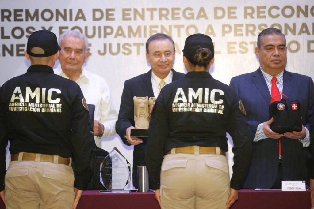 Hermosillo, Sonora; 3 de octubre de 2024.- Con el fin de contribuir al desarrollo y profesionalización de las corporaciones de seguridad encargadas de salvaguardar la integridad de las familias sonorenses, preservar el orden y la paz social, el gobernador Alfonso Durazo Montaño encabezó la ceremonia de entrega de reconocimientos, estímulos y equipamiento a personal de la Fiscalía General de Justicia del Estado de Sonora.