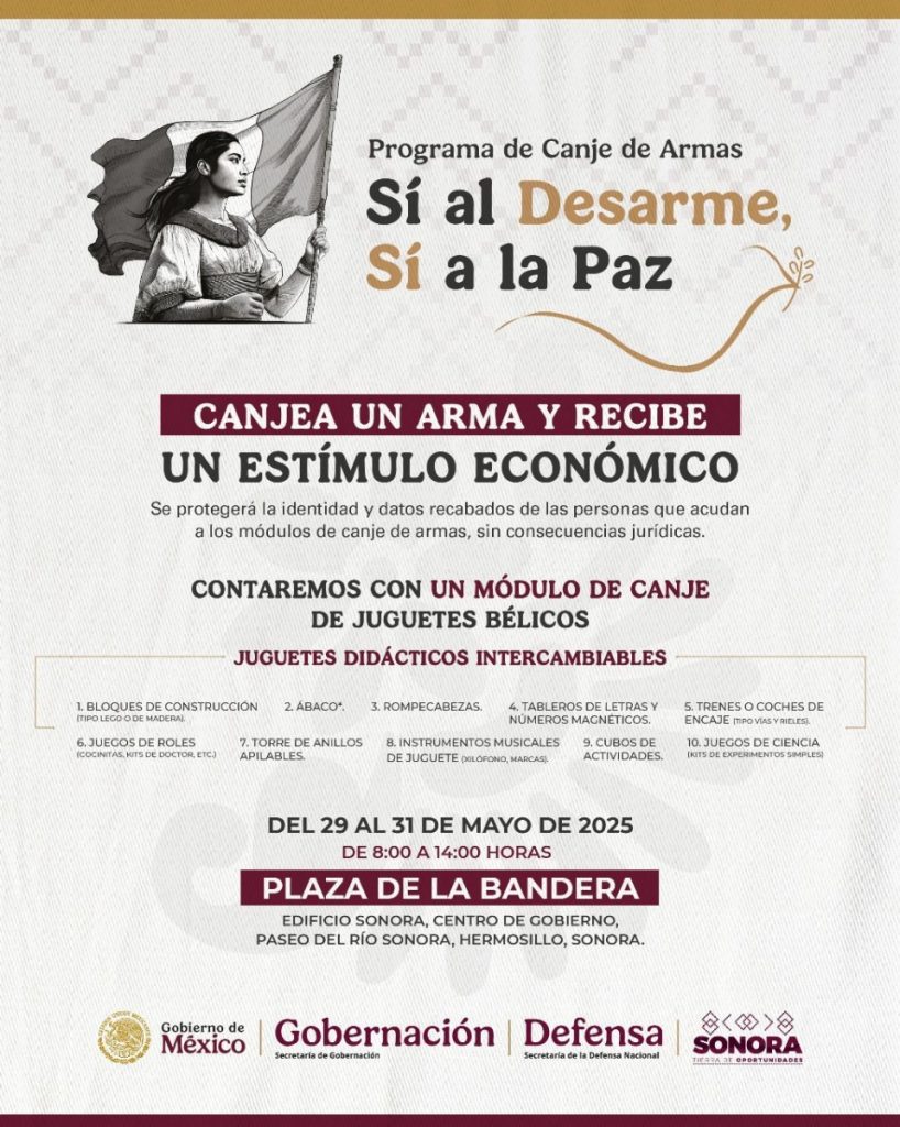 El Gobernador detalló que la jornada de canje de armas se llevará a cabo del 29 al 31 de mayo, de 8:00 a 14:00 horas, en la Plaza de la Bandera del Centro de Gobierno, en Hermosillo. A quienes acudan, se les garantiza la protección de su identidad y de los datos recabados, sin consecuencias jurídicas.