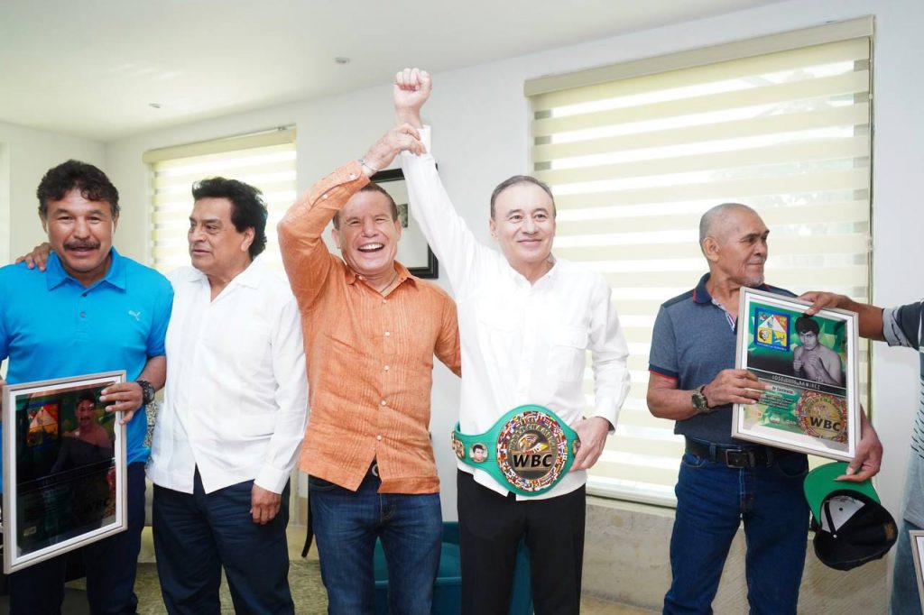 En un encuentro con los boxeadores sonorenses Hernán “Tyson” Márquez, Luis Ramón “Yori Boy” Campas, Julio César Borboa, José Luis Ramírez y la esposa de David Sánchez, Valeria Ruiz, el mandatario estatal expresó su reconocimiento a todos los deportistas por sus destacadas trayectorias en el ring, promoviendo una vida sana para las juventudes.
