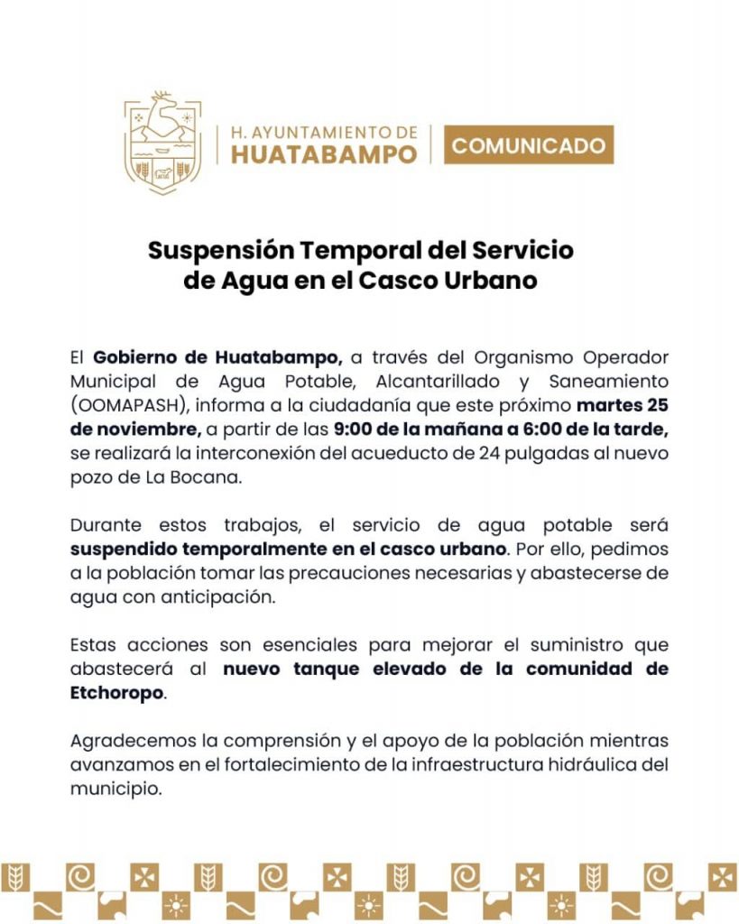 🚰 Se le recuerda a la ciudadanía huatabampense que el día de mañana se suspende temporalmente el servicio de agua. Les invitamos a tomar las precauciones necesarias.