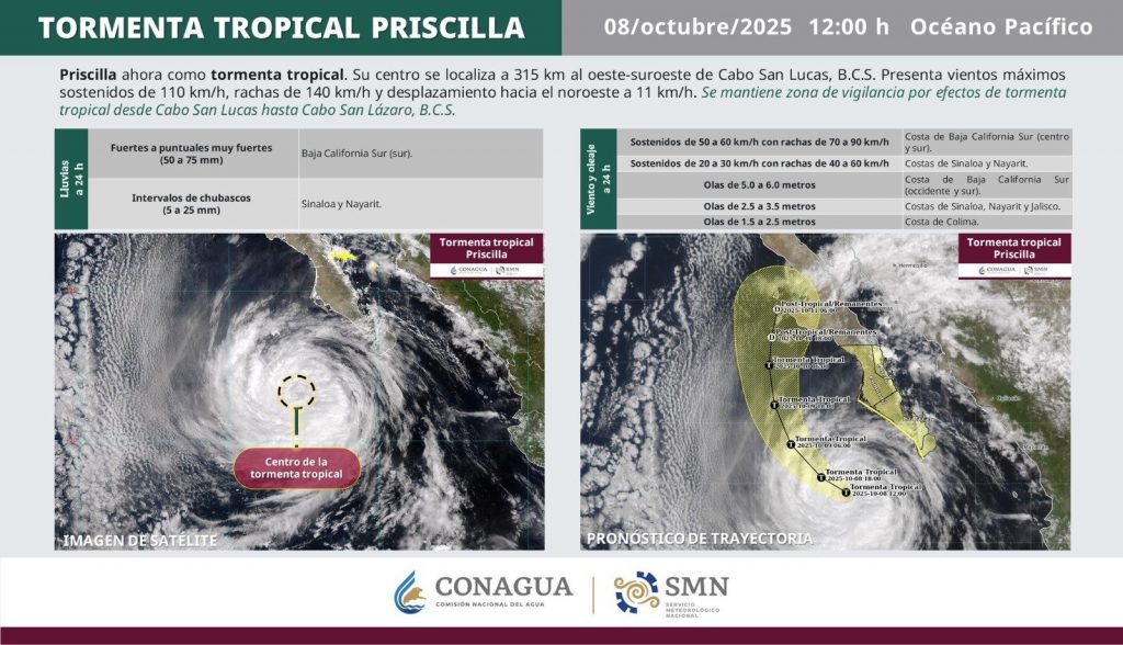 A su vez, un nuevo sistema ciclónico mantiene un 70 por ciento de probabilidad de desarrollo durante las próximas 48 horas. Dicho fenómeno presenta una tendencia de trayectoria hacia el noroeste del País, lo que podría incrementar las precipitaciones posteriores al paso de “Priscilla”.