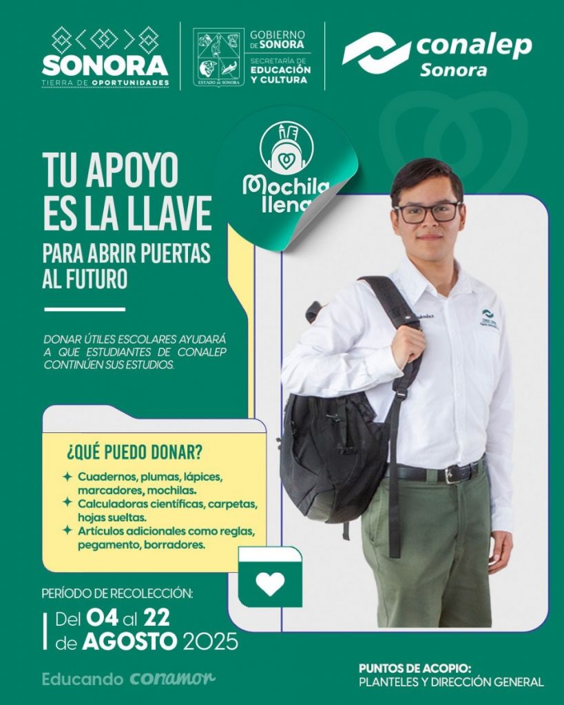 Hermosillo, Sonora.- Con la finalidad de fomentar la generosidad y el altruismo en beneficio de sus alumnos, el Gobierno de Sonora, a través del Colegio de Educación Profesional Técnica del Estado de Sonora (Conalep) invita a participar en el programa “Mochila Llena: Educando CONAmor”.