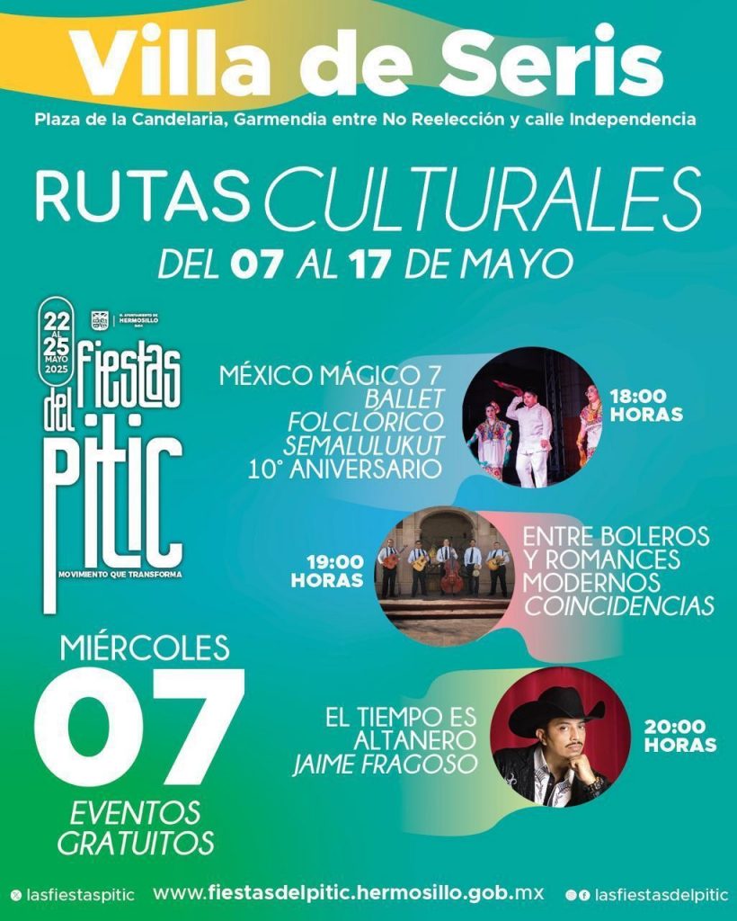 El Gobierno Municipal invita a seguir las redes de IMCA Hermosillo y la página https://fiestasdelpitic.hermosillo.gob.mx para conocer más sobre el programa de Rutas Culturales y próximas ubicaciones, así como la programación completa de las Fiestas del Pitic 2025.