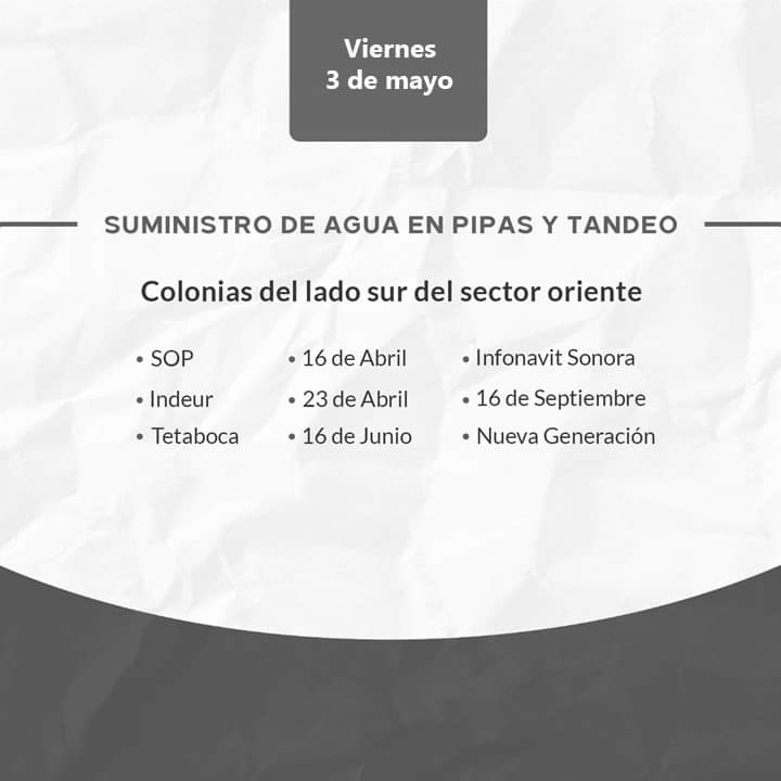 Oomapas Navojoa informa el horario de suministro de agua en pipas y tandeo en lado sur del sector oriente de la ciudad.