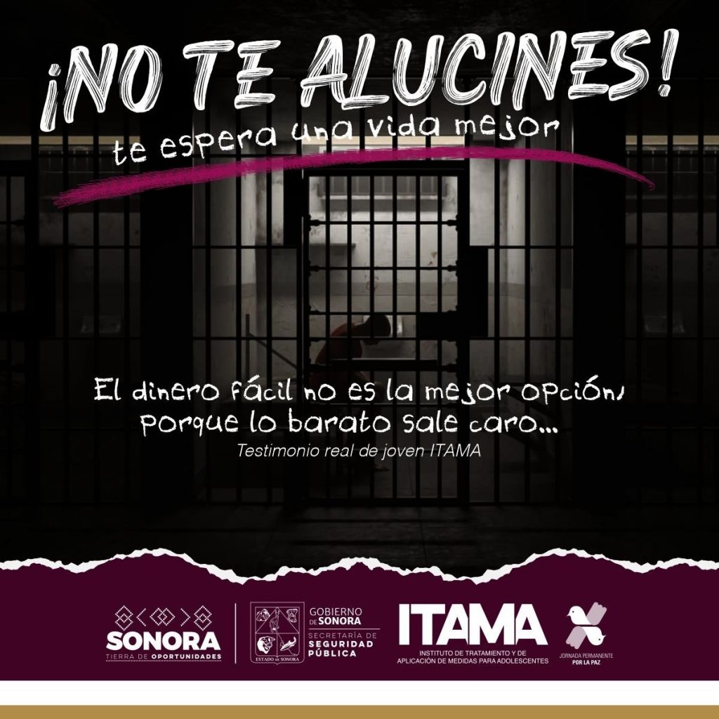 Hermosillo, Sonora.- Con la intención de que las y los jóvenes tomen conciencia sobre las repercusiones legales, personales y familiares de involucrarse en actividades ilícitas, el Gobierno de Sonora intensifica la difusión de la campaña ¡No te alucines! Te espera una vida mejor.