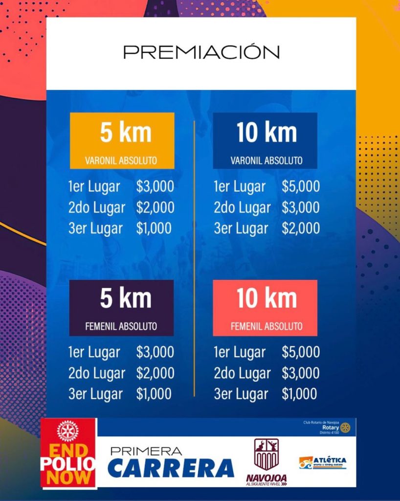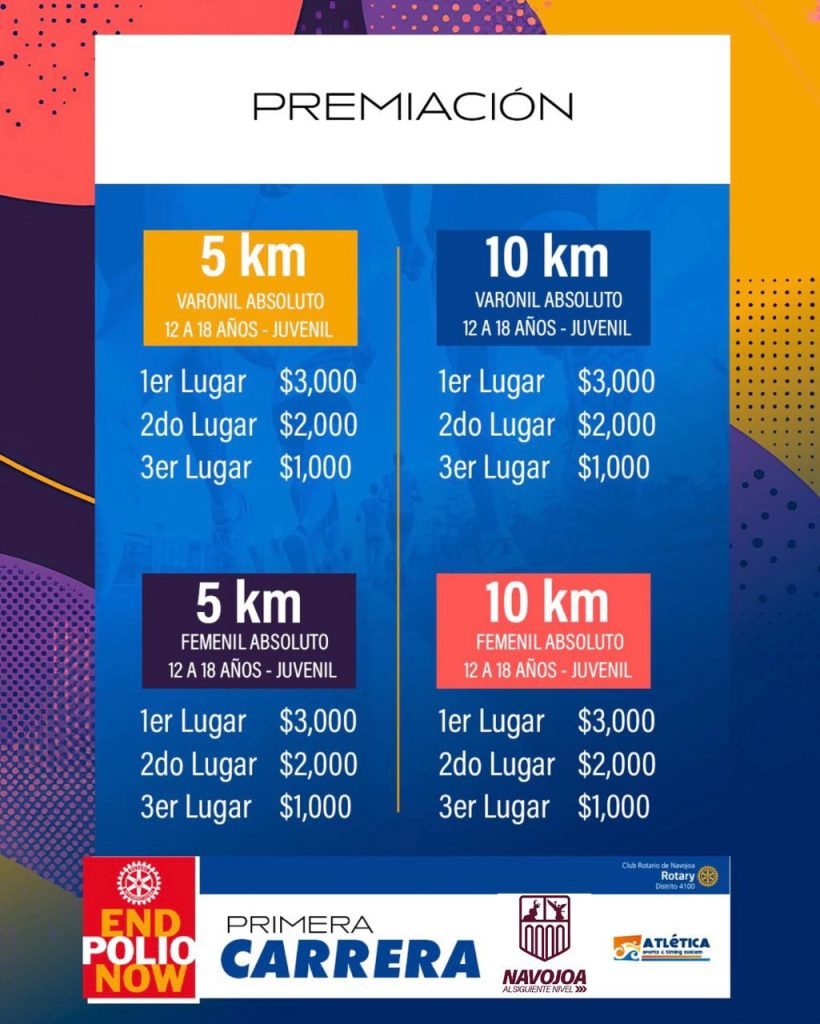 La premiación se distribuirá por categorías: 10 Km Varonil Absoluto y Femenil Absoluto $5,000 el primer lugar, $3,000 el segundo lugar y $2,000 para el tercer lugar; 10 Km Juvenil Varonil y Juvenil Femenil (12 a 18 años), los premios constarán de $3,000, $2,000 y $1,000 pesos para el primero, segundo y tercer lugar, respectivamente.