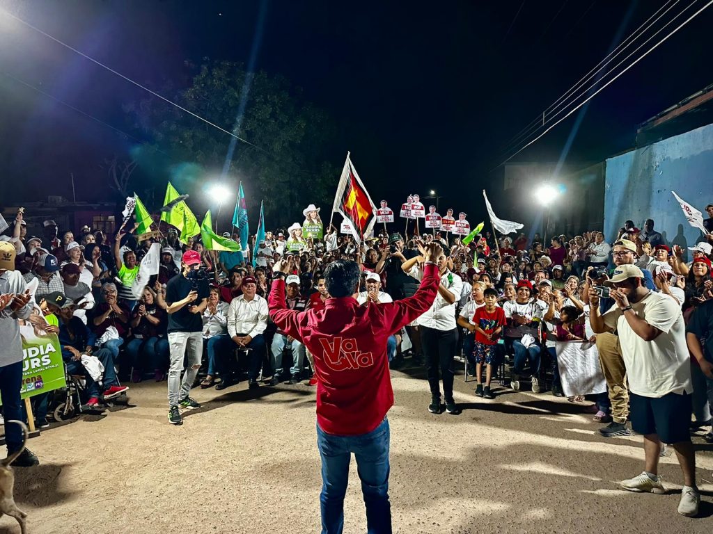 Huatabampo, Sonora, 01 de mayo de 2024.- En un ambiente de verdadera fiesta generada por el movimiento de la Cuarta Transformación, la colonia Ampliación Guadalupe Ríos de la ‘Tierra de los Generales’, se pintó de guinda para demostrarle su apoyo al candidato a la alcaldía de Huatabampo, Alberto “Beto” Vázquez.