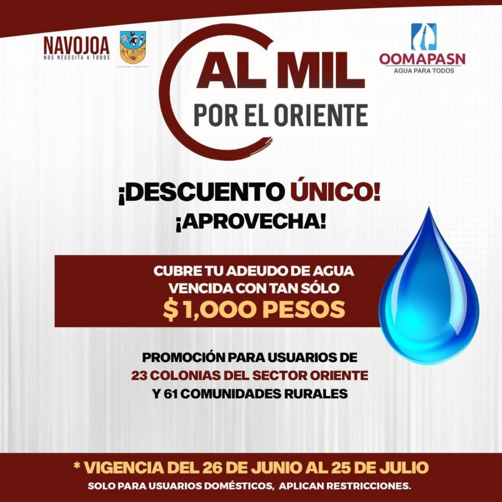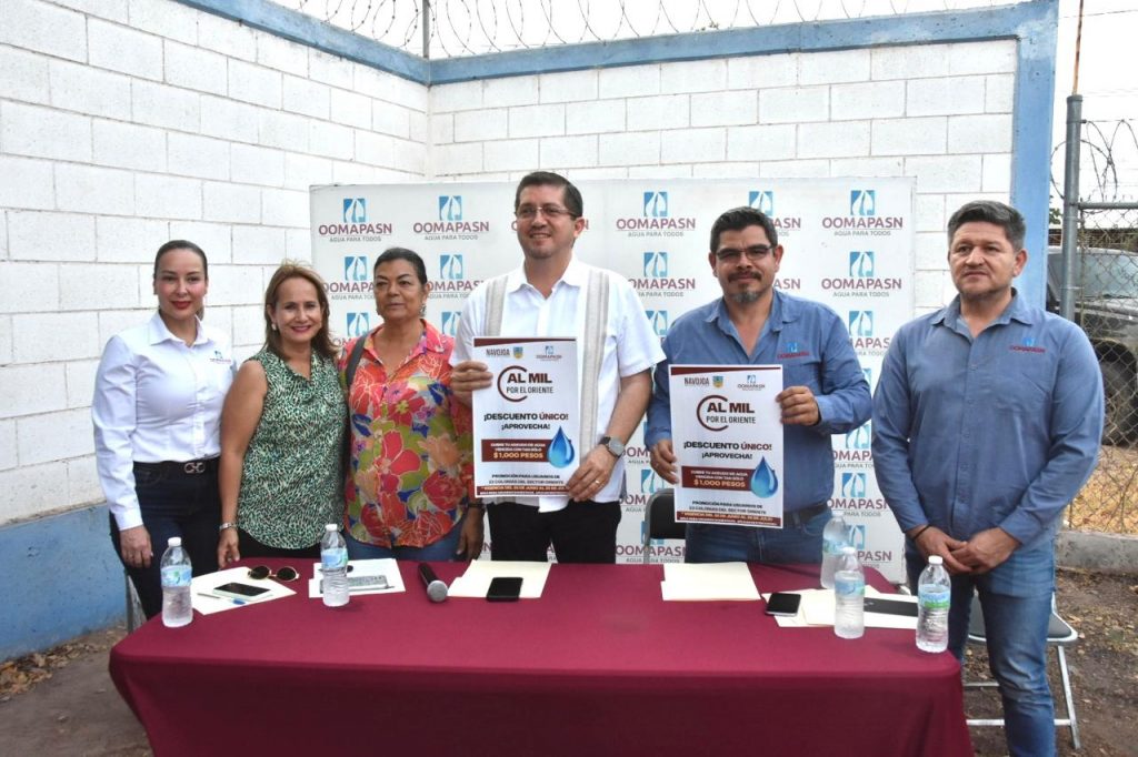 Navojoa, Sonora, 26 de junio 2024.- La liquidación total de su cuenta vencida en agua potable con tan solo el pago de mil pesos podrán realizar, a partir de este miércoles, los usuarios morosos de 23 colonias y 61 comunidades, a través de la promoción “Al Mil por el Oriente”, puesta en marcha por Oomapas Navojoa.