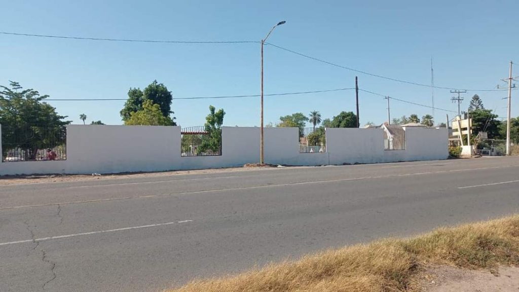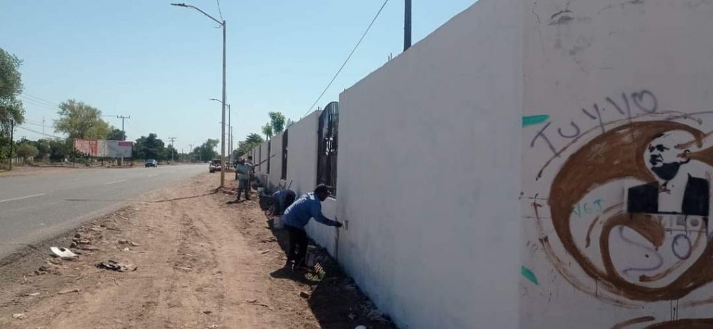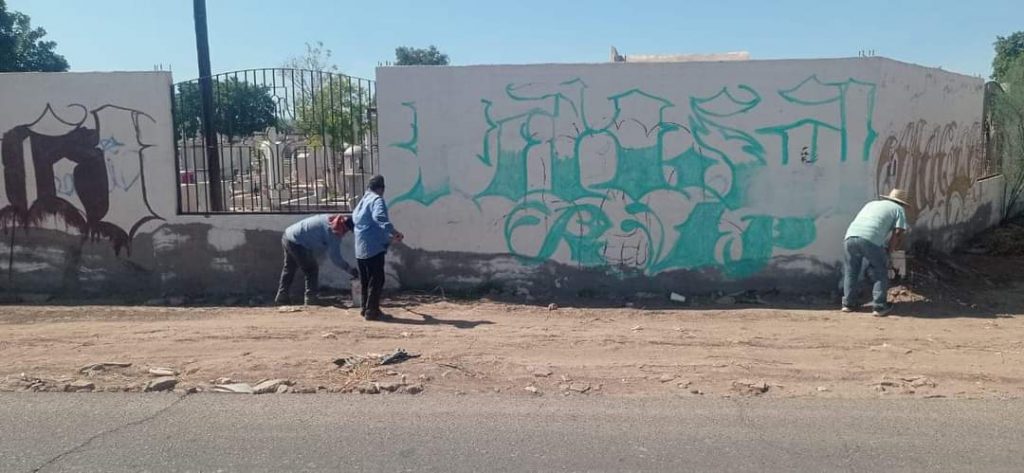 Etchojoa, Son.- El Gobierno Municipal, que preside el Luis Arturo Robles Higuera, a través de la Dirección de Obras Públicas, realizan trabajos de limpieza, retiro de escombros y pintado de la barda perimetral del panteón principal.