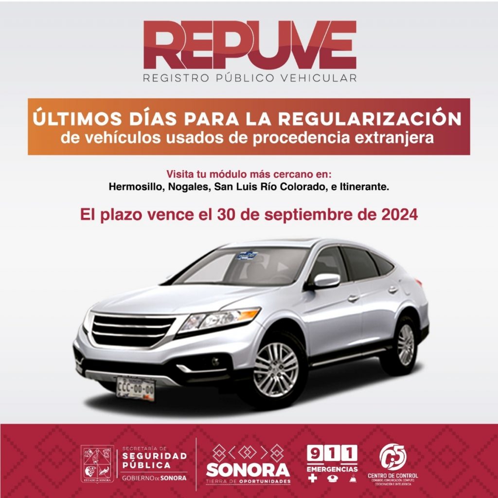 Guaymas, Sonora.- Un llamado a los sonorenses para que aprovechen los últimos días para la regularización de autos usados de procedencia extranjera, hizo el Registro Público Vehicular (Repuve), dependiente de la Secretaría de Seguridad Pública (SSP).