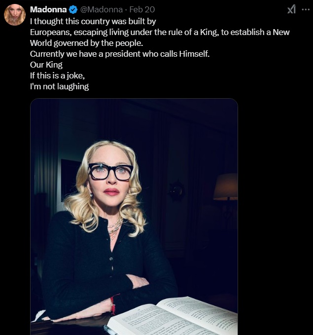 Estados Unidos (agencias).- La cantante Madonna, que se ha mostrado crítica contra algunas de las medidas que el nuevo Presidente de EU está adoptando, especialmente respecto al colectivo LGTBI+, ha vuelto a reaccionar a un mensaje de Donald Trump en el que el mandatario se compara con un rey.