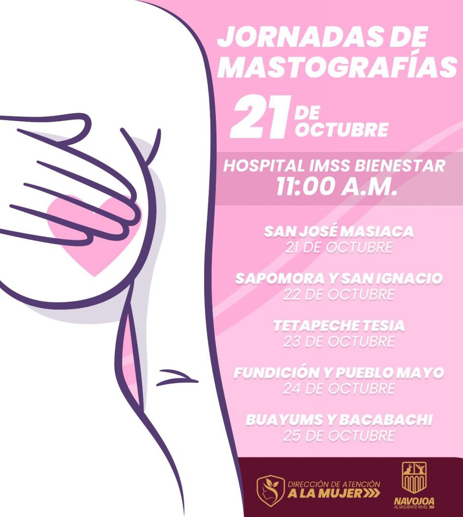 Navojoa, Son.- El Gobierno de Navojoa, a través de la Dirección de Atención a la Mujer, invita a todas las mujeres, de las siguientes, comunidades rurales a participar en nuestras Jornadas de Mastografías que comenzarán el 21 de octubre.