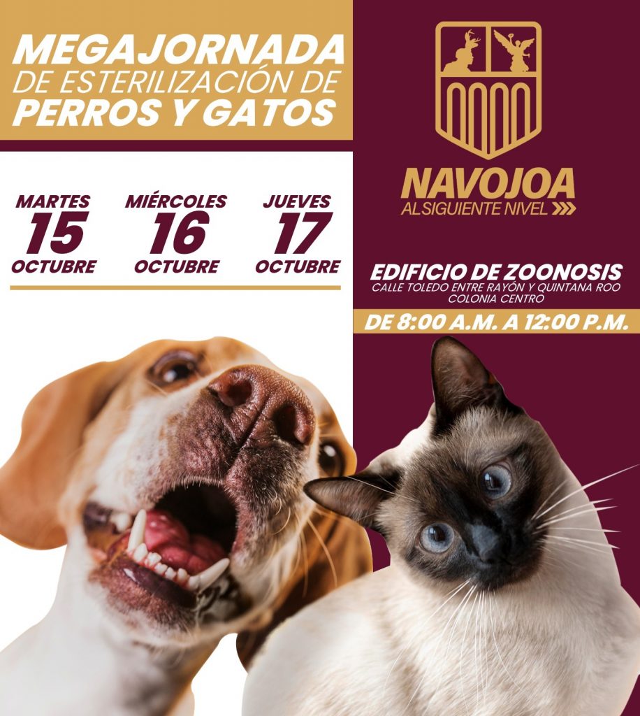 El Municipio de Navojoa te invita a aprovechar este programa que la Dirección de Salud Municipal, a través del Centro de Atención Animal Navojoa, trae para tus mascotas este martes 15, miércoles 16 y jueves 17 de octubre, de 8:00 de la mañana a 12:00 de la tarde.