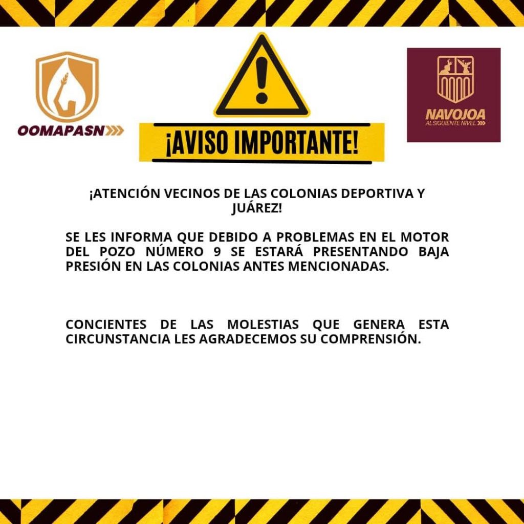 Se les informa que, debido a problemas técnicos en el motor del Pozo Número 9, se prevé una reducción temporal en la presión del suministro de agua en las colonias Deportiva y Juárez.