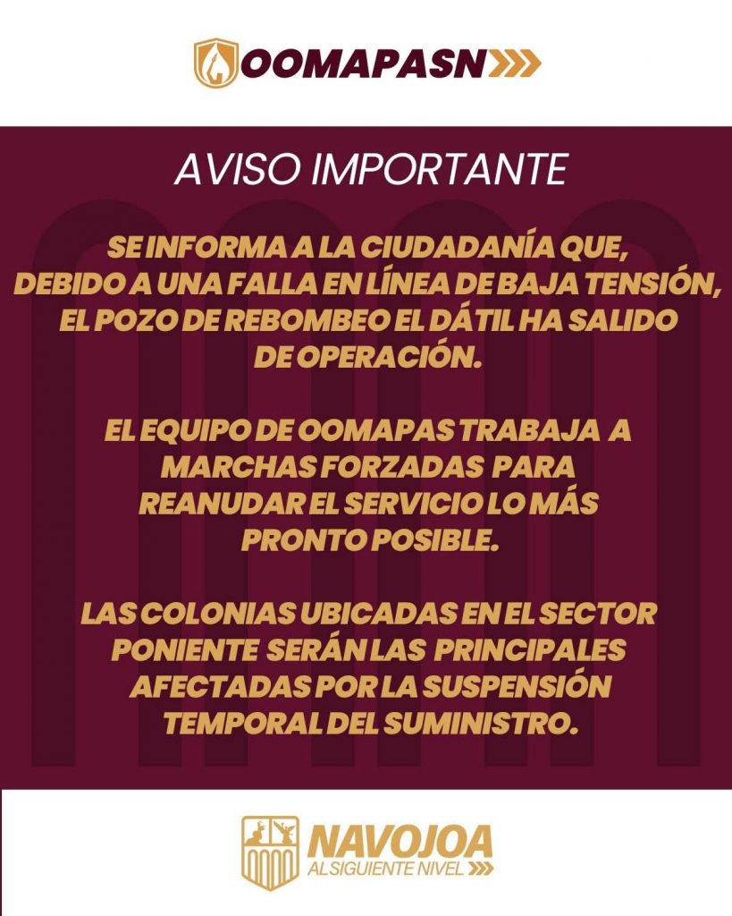 Se informa a la ciudadanía que debido a una falla en línea de baja tensión de CFE, el pozo 2 y 3 que suministran la planta de rebombeo El dátil, quedan fuera de operación.