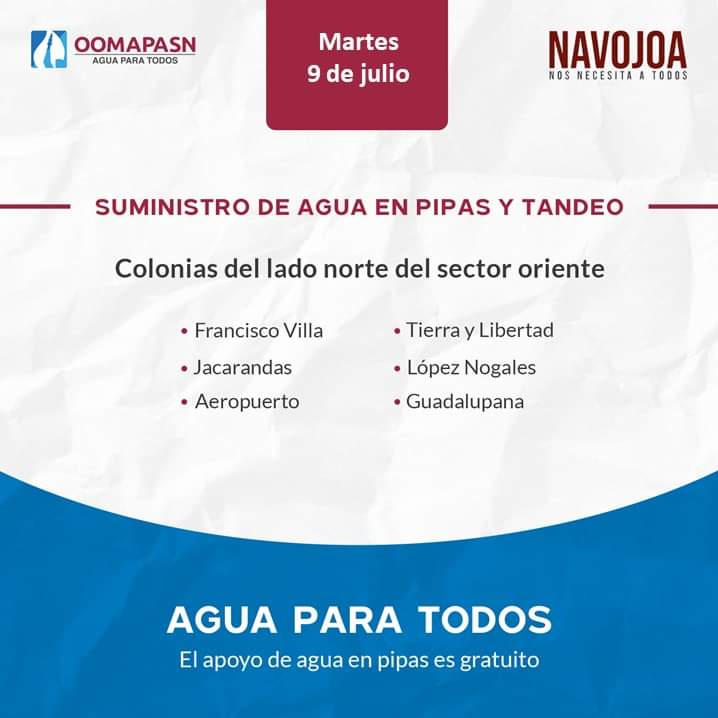 • Oomapas Navojoa Informa del área a distribuir el agua mediante tandeo y pipas.