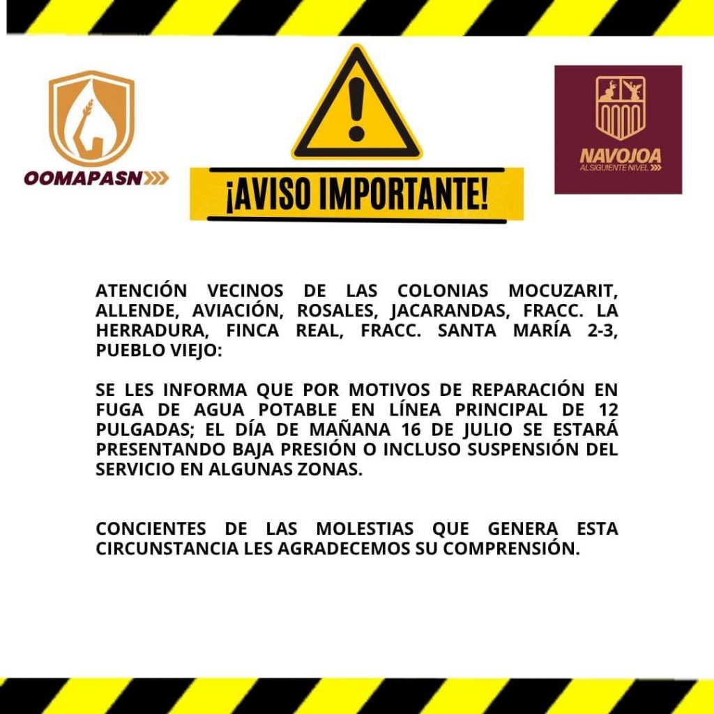 Atención vecinos de las colonias Mocuzarit, Allende, Aviación, Rosales, Jacarandas, Fracc. La Herradura, Finca Real, Fracc. Santa María 2-3, Pueblo Viejo: