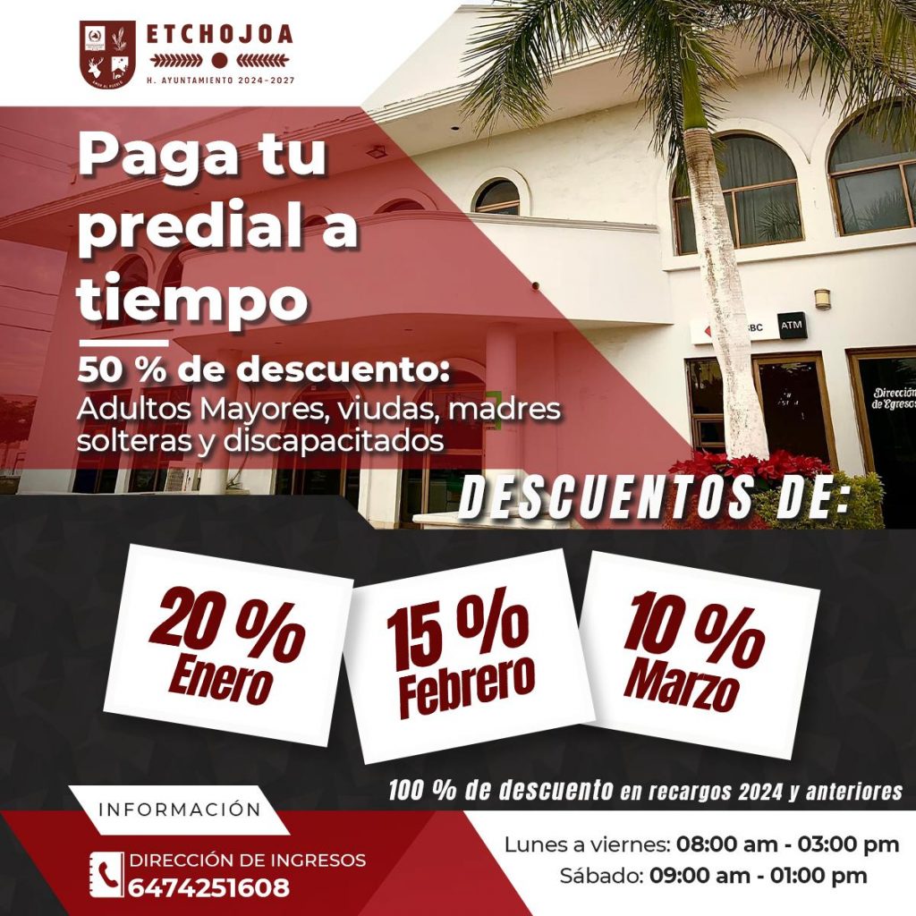 #Etchojoa, Son.- El Gobierno Municipal que preside el Ing. Luis Arturo Robles Higuera, a través de la Dirección de Ingresos, anuncia los descuentos del pago predial 2025.