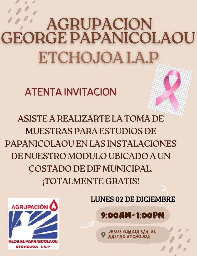 #Etchojoa, Son.- El H. Ayuntamiento de Etchojoa  y Dif Etchojoa  en coordinación con la agrupación Papanicolaou etchojoa,  te invita cordialmente a que te realices la toma de muestras para estudios de Papanicolaou. Es fundamental para tu bienestar cuidar de tu salud femenina. No dejes para mañana lo que puedes hacer hoy por tu salud. ¡Te esperamos!