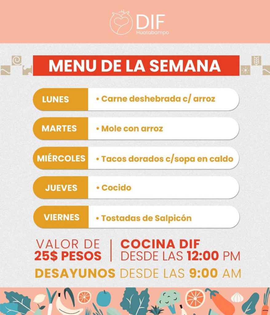De Lunes a Viernes, desde las 12:00pm. En la cocina de DIF municipal.