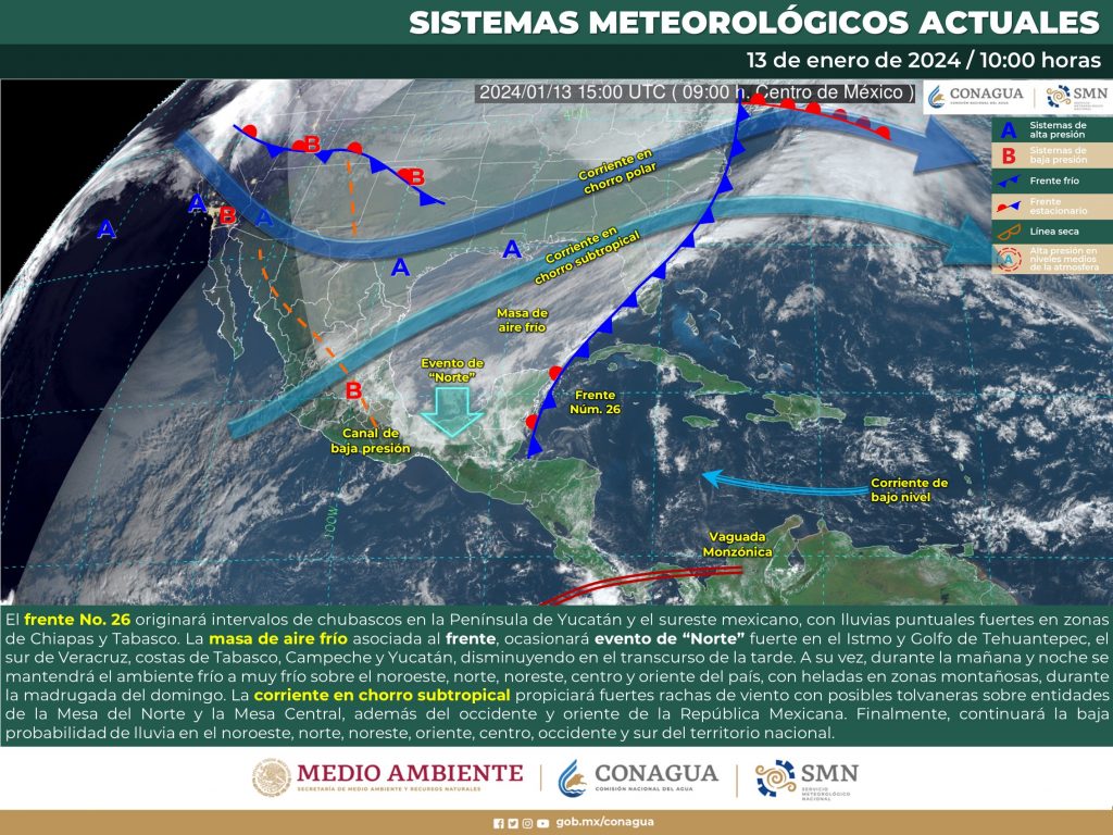 Cd. de México (agencias).- El pronóstico del clima para este sábado 13 de enero de 2024 indica que el frente frío No. 26 se localizará al oriente de la Península de Yucatán, interaccionará con un canal de baja presión ubicado en el sureste mexicano, produciendo intervalos de chubascos en ambas regiones, con lluvias puntuales fuertes en Chiapas y Tabasco.