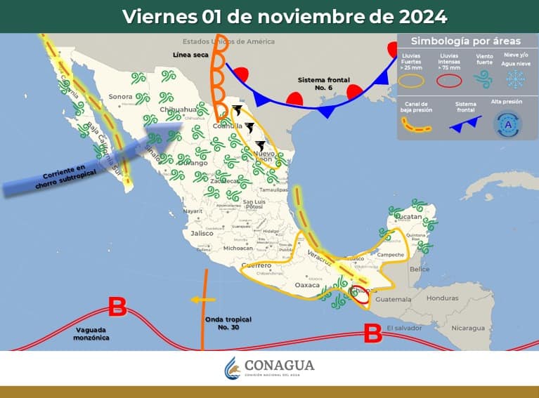 A su vez, durante los días 2 y 3 de noviembre se pronostica un nuevo frente frío (No. 7) el cual en asociación con una vaguada en altura y con la corriente en chorro polar darán condiciones aptas de precipitación sobre gran parte del territorio sonorense durante estos días. Así como un descenso marcando en las temperaturas y posible caída de aguanieve sobre los puntos más altos de la zona montañosa de Sonora.