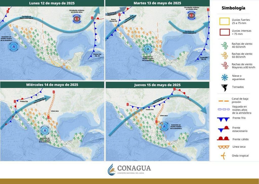 Asimismo, se mantendrán cielo medio nublado durante el día, sin lluvia en la región. Por la mañana, ambiente fresco a templado, bancos de niebla en la región. Por la tarde, ambiente caluroso a muy caluroso en la región. Viento de dirección variable de 30 a 40 km/h con rachas de 50 a 70 km/h y tolvaneras en Sonora.