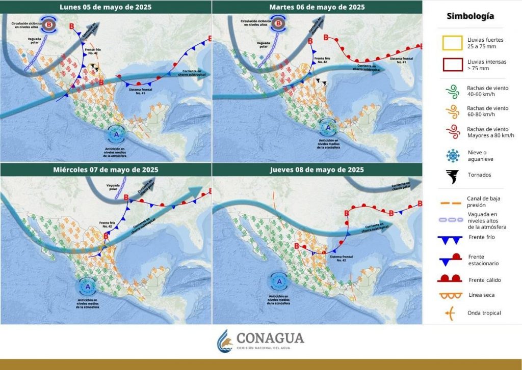 Hoy, el Frente Frío No. 42 se desplazará sobre el noroeste de la República Mexicana, se asociará con una vaguada en niveles altos de la atmósfera y con la corriente en chorro polar, provocando cielo nublado, viento con rachas de 70 a 90 km/h y tolvaneras en el norte, noreste y oriente de la Entidad. Por su parte, mantendrá cielo medio nublado con probabilidad de lluvias dispersas sobre la región de la Sierra Madre Occidental. Por su parte, generará amaneceres de fríos a frescos con temperaturas entre los 0 a 5°C en dicha zona.