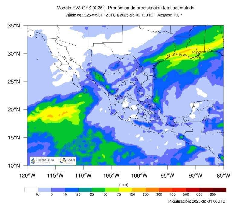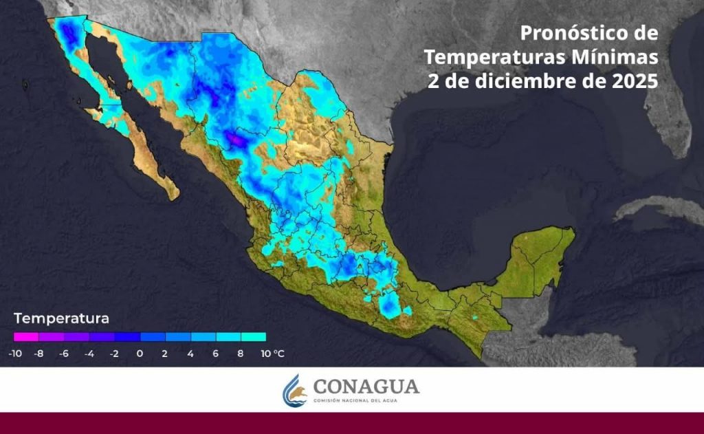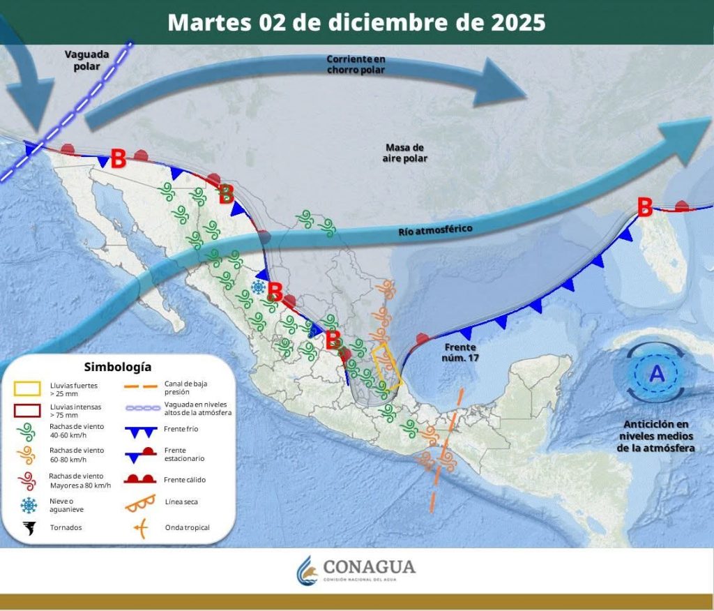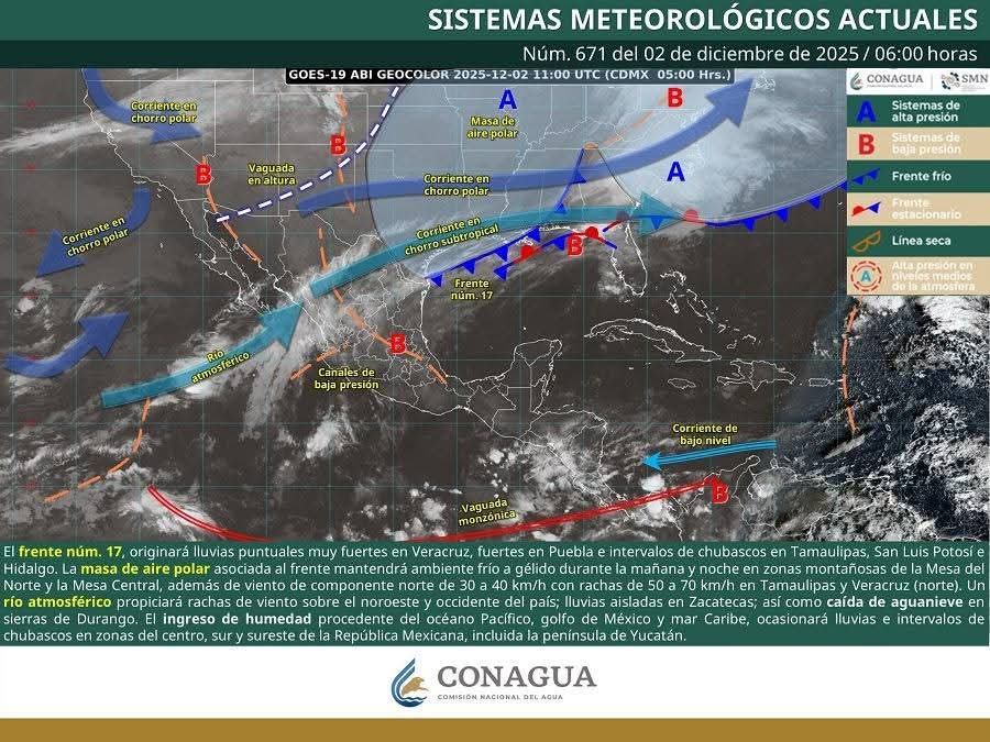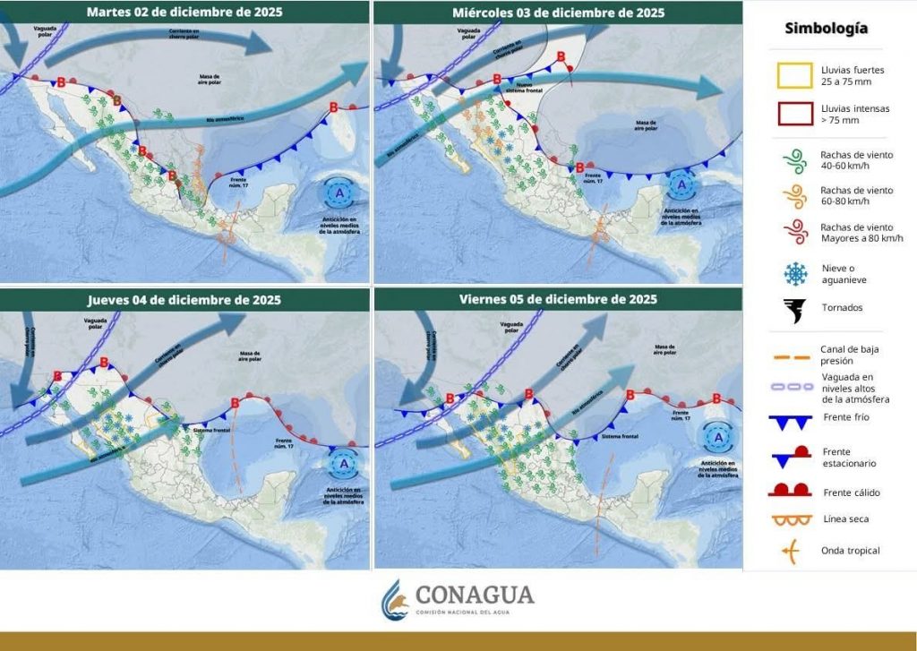 Por su parte, un nuevo frente frío se aproximará sobre la frontera norte de Sonora durante el día 04 de diciembre ocasionando un marcado descenso de temperaturas, lluvias de ligeras a moderadas, rachas de viento fuertes y la probabilidad de caída de nieve y aguanieve sobre la región montañosa.