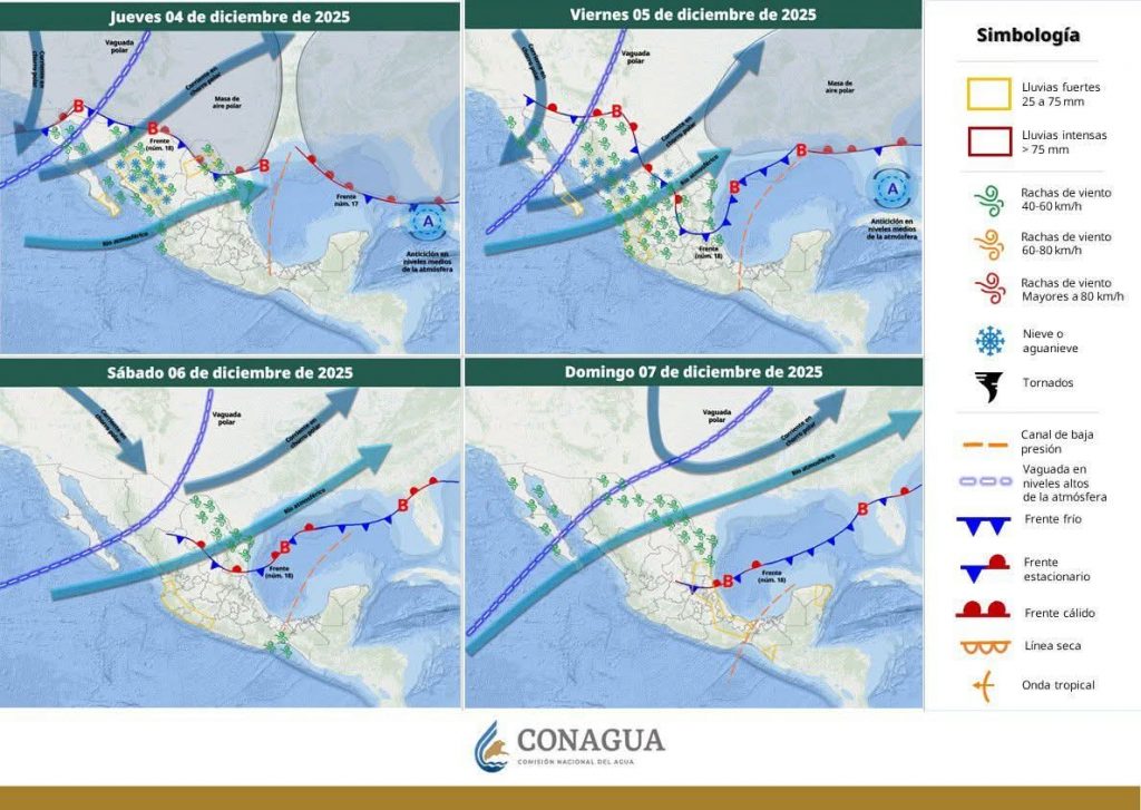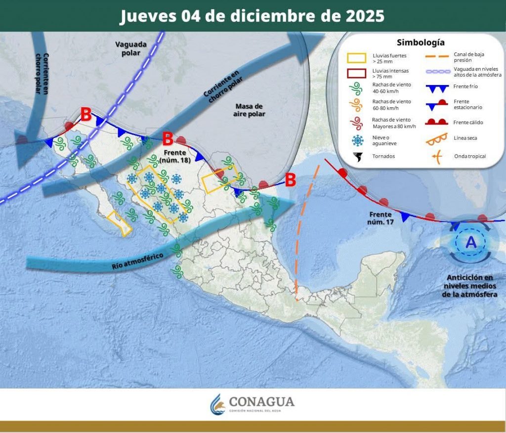 Para hoy, el frente frío (núm. 18) se extenderá con características de estacionario sobre el noroeste y norte del territorio nacional, continuará interaccionando con una vaguada en niveles medios y altos de la atmósfera, con la corriente en chorro polar y con un río atmosférico, generando descenso de temperatura, rachas de viento de hasta 60 km/h y lluvias de ligeras a moderadas sobre la región sur y oriente; además de probabilidad para la caída de nieve o aguanieve en la zona montañosa sur limítrofe con Chihuahua.