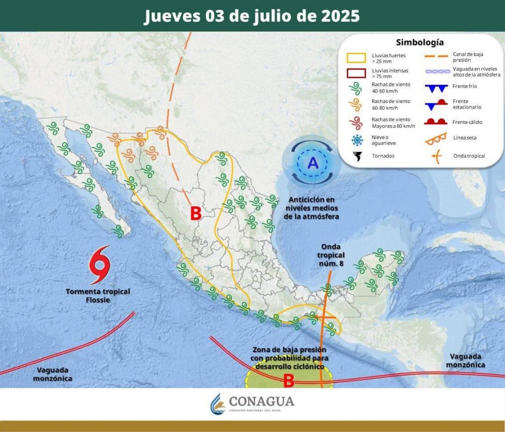 Durante hoy, el patrón de circulación tipo monzón sobre el noroeste de México, originará chubascos y lluvias fuertes a muy fuertes acompañadas con descargas eléctricas y posible caída de granizo durante horario vespertino sobre municipios del oriente, norte, sur y centro. Esto, alimentado por un incremento de humedad generado por el sistema tropical “Flossie” en el estado de Sonora.