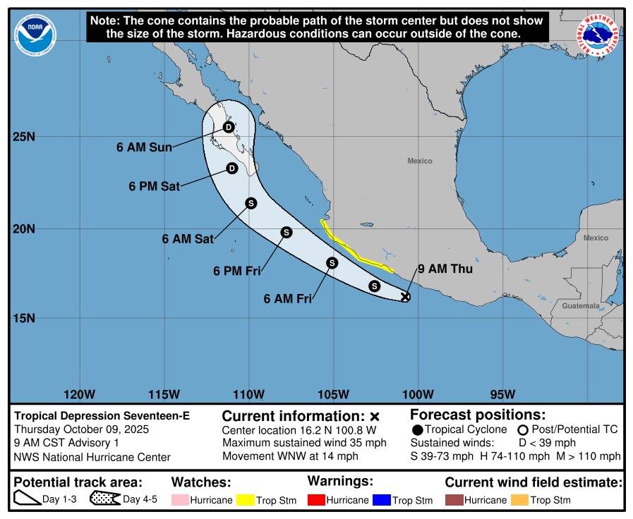 El sistema se moverá paralelo a la costa, muy cerca de Michoacán, Colima y Jalisco el viernes, y más tarde, sobre Baja California Sur. Tras su paso por tierra, se prevé que ingrese al Golfo de California, perdiendo fuerza gradualmente.