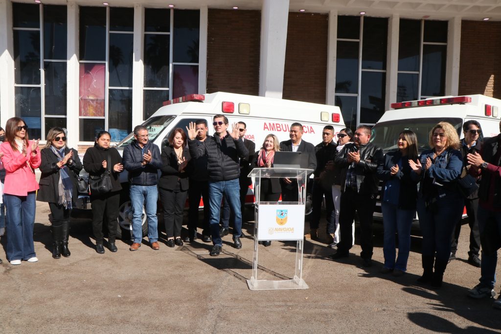 Navojoa, Sonora, 30 de enero 2025.- Para traslados, urgentes y programados, de enfermos de escasos recursos, fueron entregadas hoy tres ambulancias al DIF y Dirección de Salud, en un evento presidido por el Alcalde Jorge Alberto Elías Retes, quien ratificó el compromiso de avanzar hacia una mejor calidad de vida de los navojoenses con la aplicación eficiente de sus contribuciones.