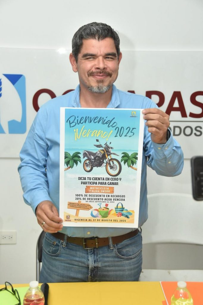 Navojoa, Sonora, 7 de julio 2025.- Oomapasn anunció este lunes el arranque de la promoción “Bienvenido el Verano 2025” en la que rifará una motocicleta DM300, de la marca Italika, equipada con casco protector y Seguro por Responsabilidad Civil, entre los usuarios domésticos, del área urbana y rural, que presenten saldos en cero adeudo del 7 de julio al 31 de agosto próximo.