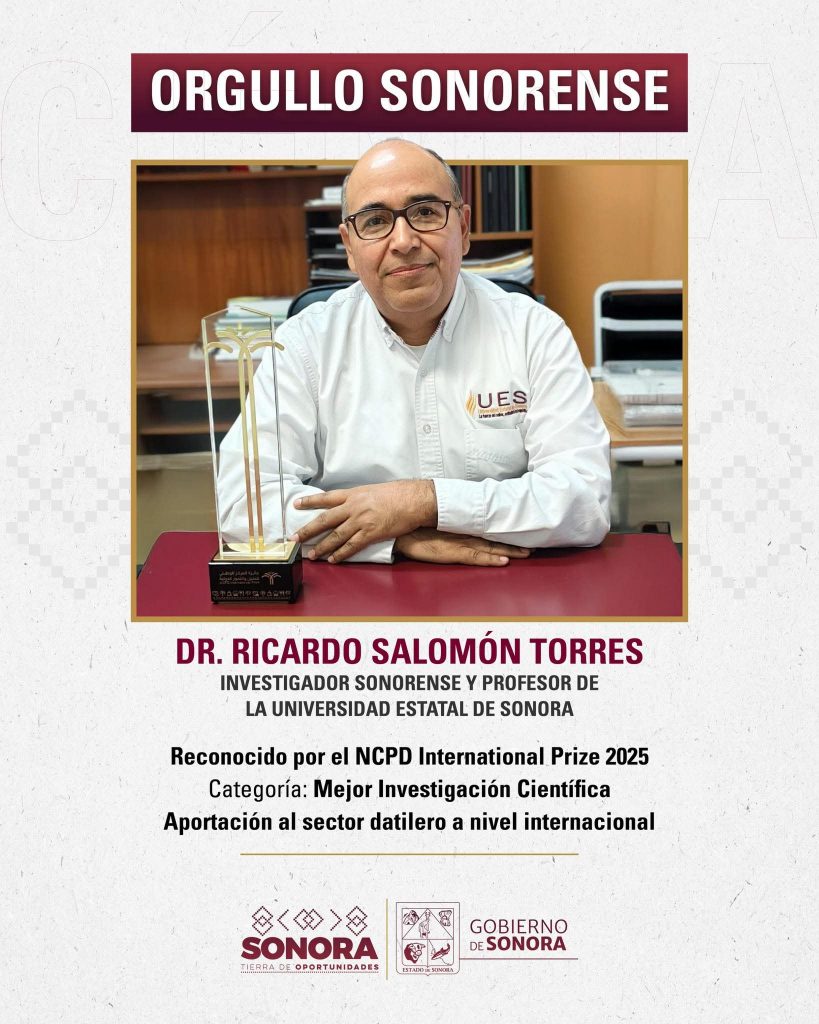 El Gobierno del Estado de Sonora reconoce al investigador sonorense, Dr. Ricardo Salomón Torres, premiado con el NCPD International Prize 2025 por su contribución científica al sector datilero.