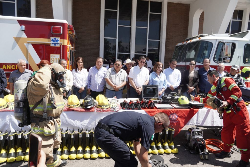 Navojoa, Sonora, 26 de junio 2025.- A la vanguardia en Sonora se ratificó hoy el Departamento de Bomberos de Navojoa con la dotación de una ambulancia de las más modernas para emergencias cardiacas, una unidad extintora de combate a incendios y rescate urbano, herramientas y equipo ligero de protección personal para los elementos, entrega formalizada por el alcalde Jorge Alberto Elías Retes ante regidores y funcionarios del gabinete.
